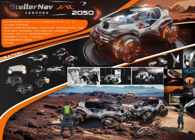 2023年江汽集团创意设计挑战赛的主题是智慧宇宙,所以,自然而然地就可以联想到在未知星系中穿行的这么一个场景,设计出了一款致力于未知星球探索的交通工具。
